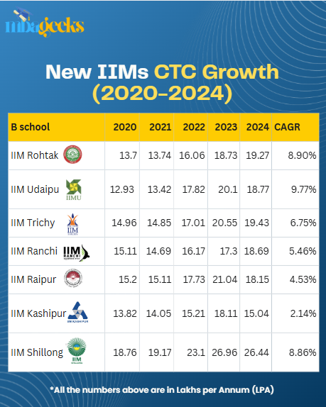 The data reflects steady annual growth with IIM Udaipur and IIM Shillong leading in CAGR.