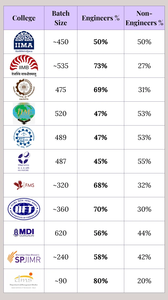 A diverse MBA batch composition isn't just a statistic; it changes the learning experience. Non-engineers bring perspectives from commerce, humanities, and law that are essential for marketing and HR roles, while engineers provide the analytical depth needed for consulting and operations. Whether you are targeting the top 10 MBA colleges for non-engineers or looking for a tech-heavy cohort, these batch profiles are the best indicator of your future peer group.