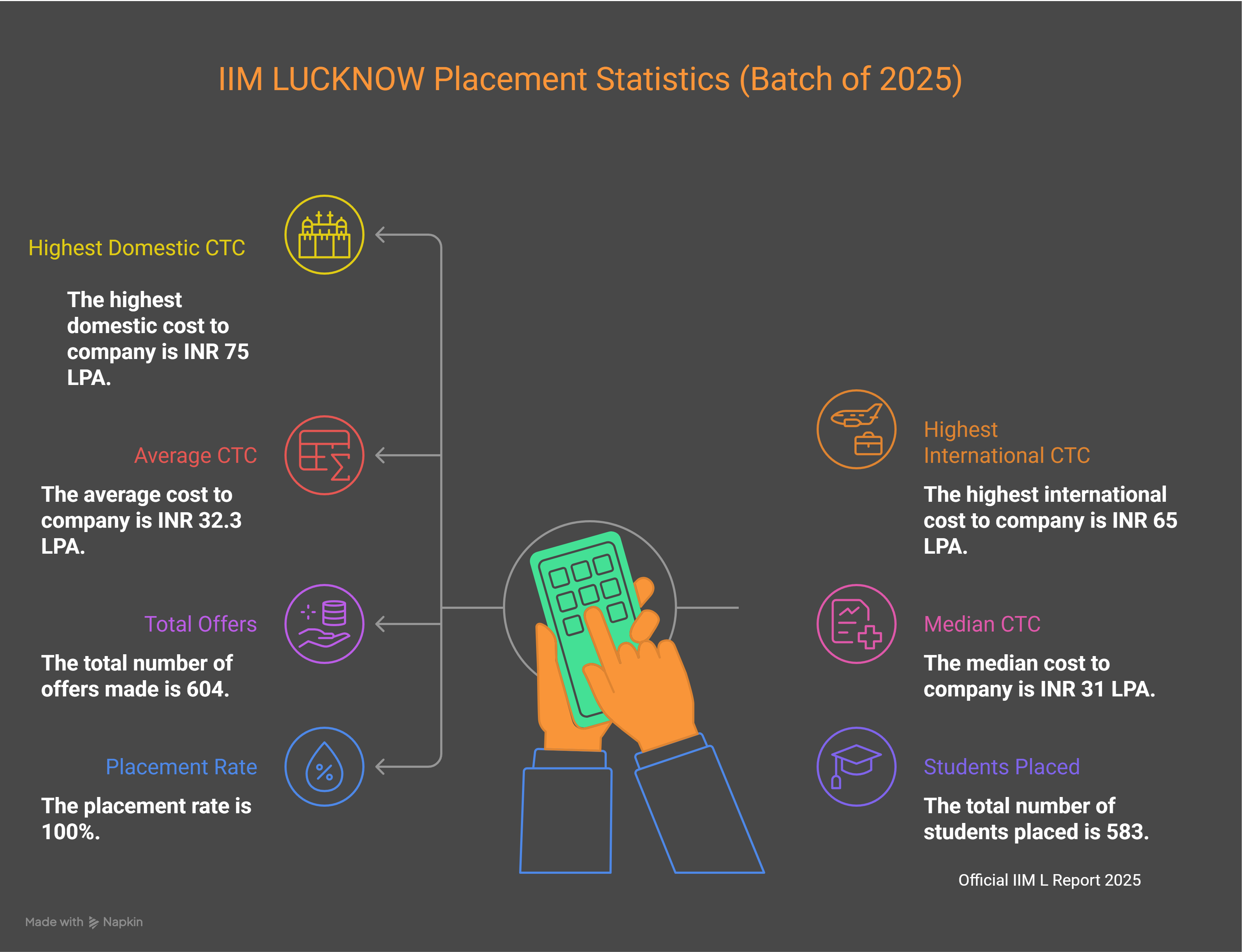 IIM Lucknowits top-tier management institution. The institute has achieved a 100% placement rate, with a total of 604 offers extended to 583 students.