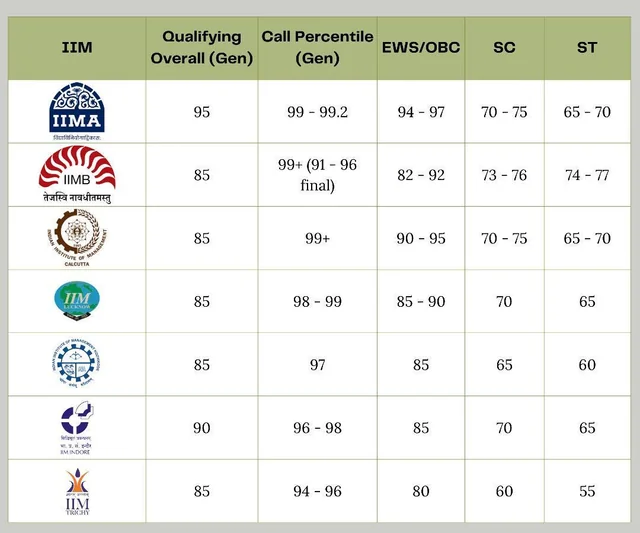 • IIM Ahmedabad: Recently increased its qualifying bar to 95 percentile. However, for a "pure" call, the actual threshold is often 99.7+ for engineers.
