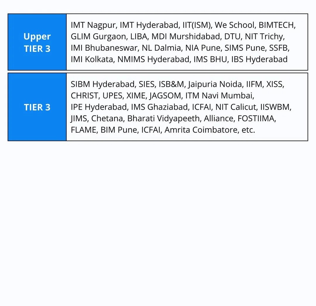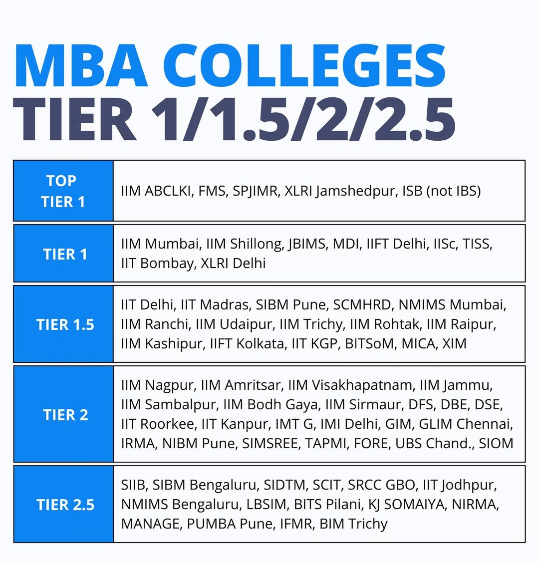MBA colleges are often grouped into tiers based on factors like placement records, brand value, alumni network, faculty, and ROI.